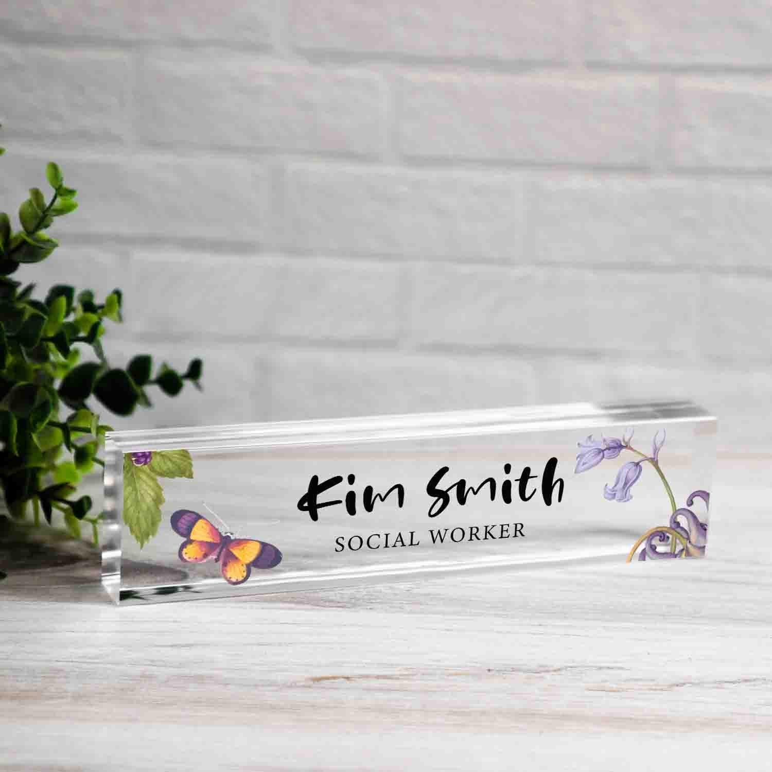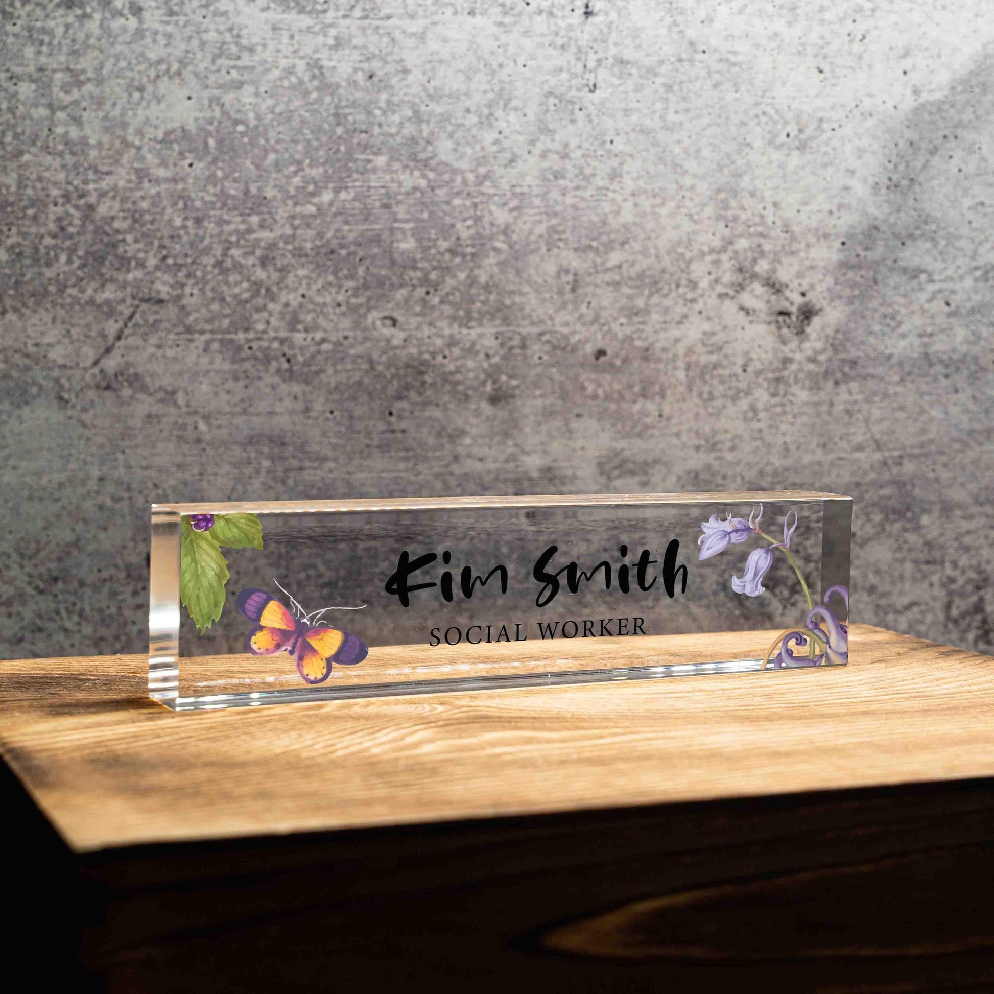 Personalized Nameplate for Social Worker or any title, Custom Name Wedge, Floral Desk Sign Decor, Office Job Title Desk Bar Clear Name Plate